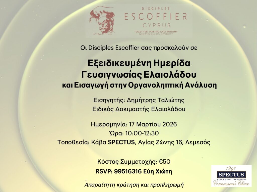 Οι Disciples Escoffier σας προσκαλούν σε μια εξειδικευμένη ημερίδα γευσιγνωσίας ελαιολάδου, με στόχο τη γνωριμία και την εισαγωγή στην οργανοληπτική ανάλυση του ελαιολάδου. Η ημερίδα θα εστιάσει στην αναγνώριση και αξιολόγηση των θετικών και αρνητικών οργανοληπτικών χαρακτηριστικών του ελαιολάδου, στη διάκριση ποιοτικών κατηγοριών και ιδιαιτεροτήτων του, καθώς και στις βέλτιστες πρακτικές φύλαξης και διαχείρισης του προϊόντος.