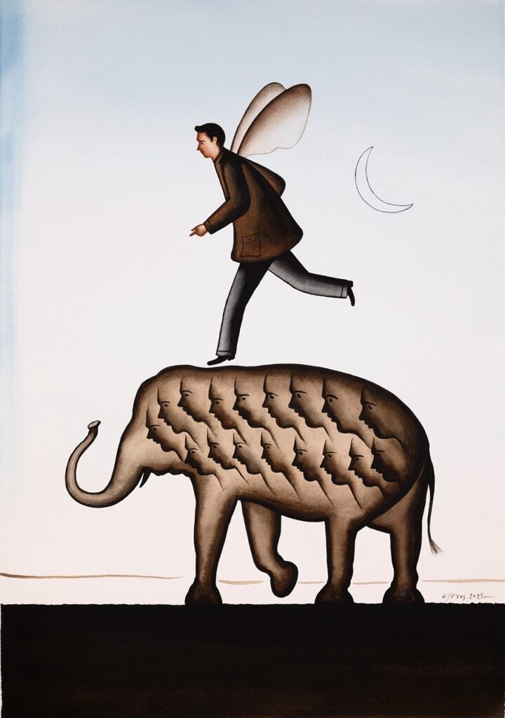 Και όμως, με όλο αυτό το εικαστικό στυλιζάρισμα και την αυστηρά ελεγχόμενη γραφιστική γραμματική, ο Γέρος κάνει κάτι που φαίνεται αδύνατο ή απίθανο. Το αισθητικό του όραμα είναι ένας κόσμος από μόνος του. Σε αυτόν δημιουργεί φανταστικούς τόπους και χώρους, καταστάσεις και συναντήσεις που αντιστέκονται στην εύκολη ερμηνεία, λειτουργώντας έξω από τις υποδηλωτικές και συνδηλωτικές μήτρες που συνήθως στηρίζουν το νόημα και, εν τέλει, την ερμηνεία. Η αίσθηση που αποκομίζω κάθε φορά που βλέπω το αισθητικό όραμα του Γέρου είναι μια απογύμνωση του καλλιτέχνη στα στοιχειώδη που τον απασχολούν – μια προσπάθεια να είναι όσο γίνεται πιο ειλικρινής με τον εαυτό του όσον αφορά την κυρίαρχη, συνεχή επιδίωξή του να συναντήσει και να καταπιαστεί με τη βασική συναισθηματική του αλήθεια.