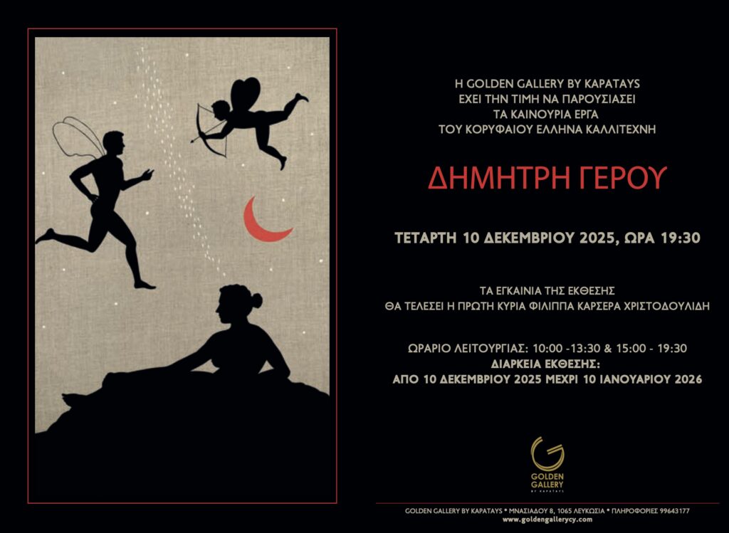 Η Golden Gallery της Λευκωσίας  παρουσιάζει από 10 Δεκεμβρίου 2025 έως 10 Ιανουαρίου 2026  την ατομική έκθεση  ζωγραφικής  του Δημήτρη Γέρου. Τα εγκαίνια θα κάνει η Πρώτη Κυρία  Φιλίππα Καρσερά – Χριστοδουλίδη.