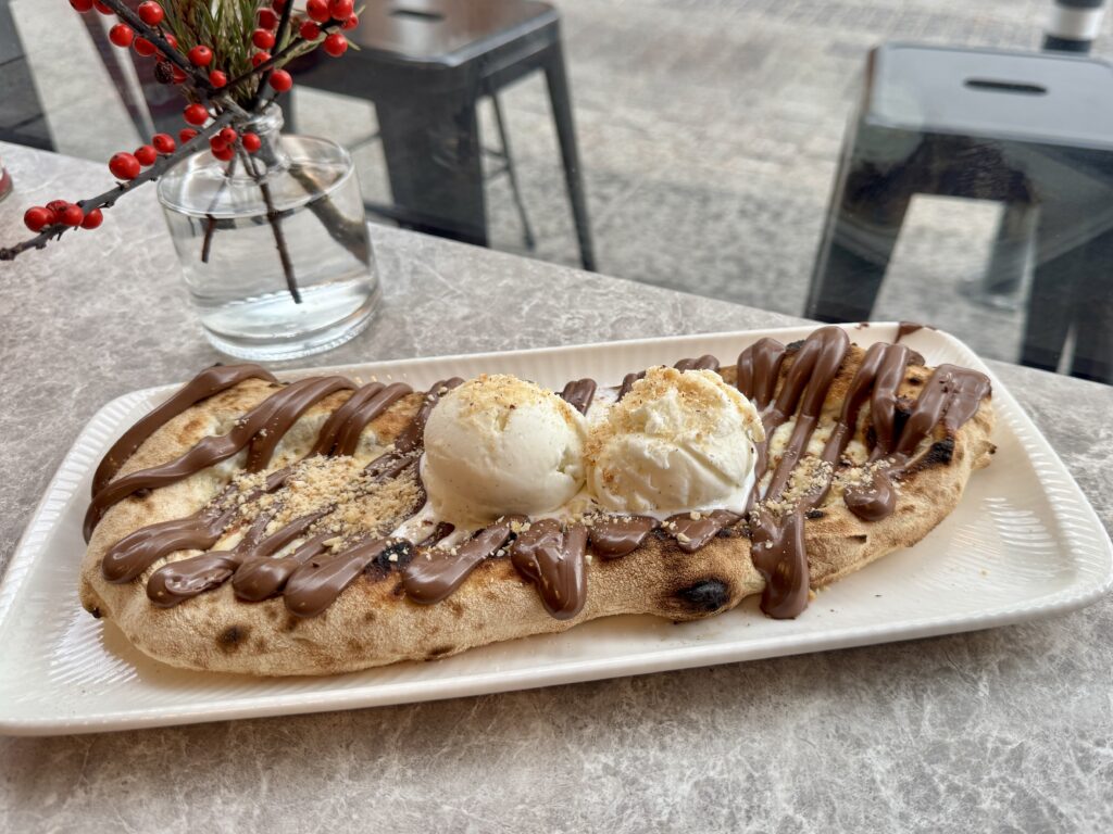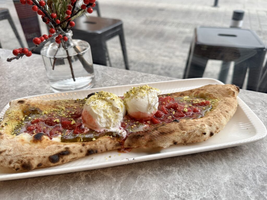 Κράτα λίγο χώρο, γιατί ο περίοπτος, εξειδικευμένος για πίτσες φούρνος της Biga θα ξεφουρνίσει και για τη δική σου αφεντιά το δίδυμο των γλυκών πειρασμών: το Nutella and Mascarpone με καβουρδισμένα φουντούκια και την επίσης δομημένη με ζύμη πίτσας δημιουργία, με πρωταγωνιστές την κρέμα από πιστάτσιο, τις σιγομαγειρεμένες φράουλες με sherry και κάρδαμο, αλλά και το αέρινο μασκαρπόνε μαζί με παγωτό βανίλια.