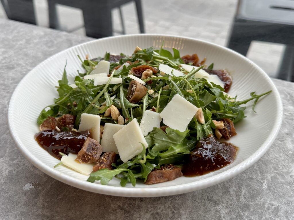 Η σαλάτα με άγρια μικρόφυλλη ρόκα, βινεγκρέτ βαλσαμικού ξιδιού, αποξηραμένα σύκα, φλοίδες Parmigiano Reggiano, νοτισμένη με chutney σύκου και φουντούκια, σαφώς πρέπει να φτάσει και στο δικό σου μοιρασιάτικο τραπέζι ή να αποτελέσει το κυρίως σου πιάτο για dine in ή και για take away.