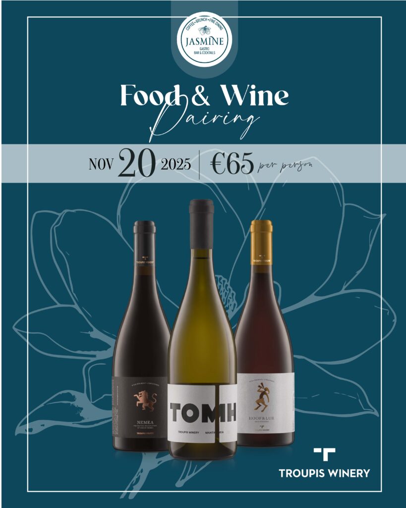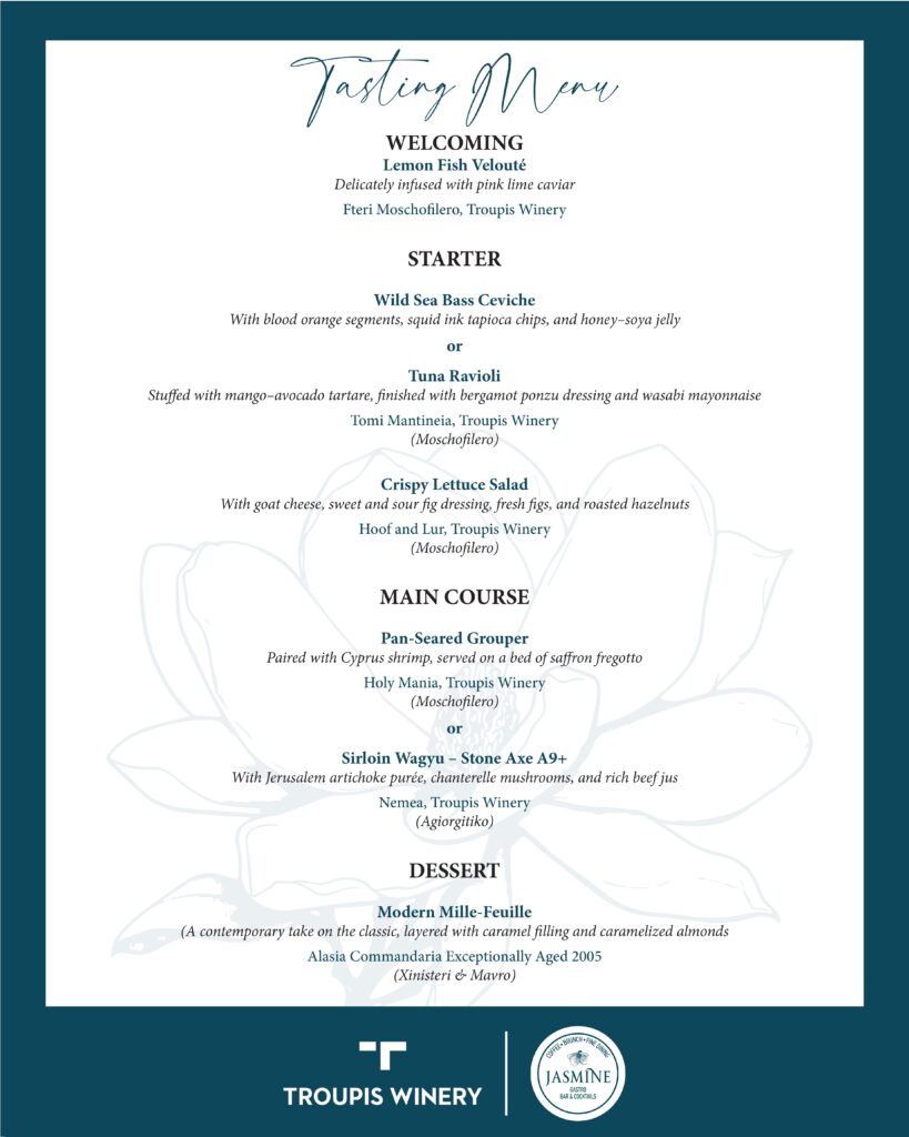 Οι λάτρεις της οινογαστρονομίας θα έχουν την ευκαιρία να απολαύσουν επιλεγμένες ετικέτες του οινοποιείου από τη σειρά Troupis, αρμονικά συνδυασμένες με το πέντε σταδίων tasting menu της βραβευμένης ομάδας σεφ του Jasmine Gastrobar. Ένα μενού υψηλής δημιουργικότητας, όπου κάθε πιάτο συναντά το ιδανικό κρασί, δημιουργώντας μια ολοκληρωμένη εμπειρία γεύσης.