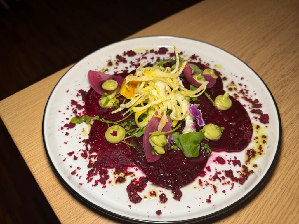 Το καρπάτσιο παντζαριού, που θα μπορούσε να ήταν και έργο τέχνης στα χέρια κάποιου καλλιτέχνη, ήρθε να δώσει χρώμα και ένταση. Ακτινίδιο και αβοκάντο μους, πίκλες από κόκκινο κρεμμύδι, φινόκιο και ραπανάκια. Οξύτητες που ξυπνούν τον ουρανίσκο, ο οποίος διερωτάται πώς ένα πιάτο λαχανικών μπορεί να έχει τόση ισορροπία. Από εκείνα τα πιάτα που δεν θέλεις να χαλάσεις, αλλά τελικά το κάνεις – και καλά κάνεις.