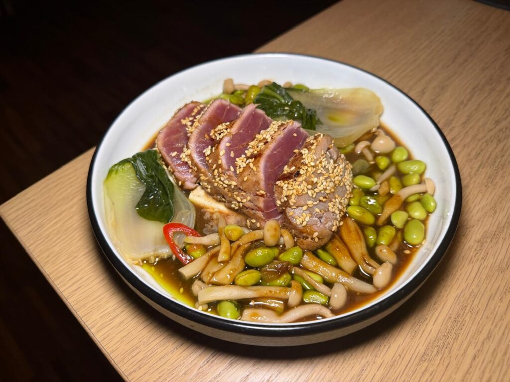 Και μετά, ο άψογα ψημένος τόνος. Πάντρεμα με μανιτάρια, λαχανικά, τόφου και ζωμό miso. Πιάτο με βάθος, με ουσία, με εκείνη την “παρθενογένεση” στη γεύση που δεν εξηγείται εύκολα. Το καλύτερο και πληρέστερο πιάτο της βραδιάς;;;;;; Πολύ πιθανόν.