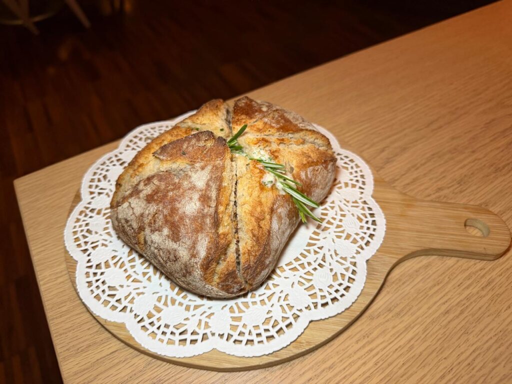 Και εκεί που αργοπίνεις και η μια κουβέντα φέρνει την άλλη, στο τραπέζι σου φτάνει το ψωμί. Και εδώ, στα απλά, φαίνεται η πρόθεση. Αρωματικό βούτυρο στο κέντρο, αγγιγμένο με φρέσκο δεντρολίβανο. Χωρίς υπερβολές, χωρίς φιοριτούρες. Μα κάθε μπουκιά και κάθε κριτς από την τραγανή του κόρα σε καλεί για άλλη μία… μέχρι που δεν μένει τίποτα. Και ναι, έμειναν μόνο λίγα ψίχουλα.