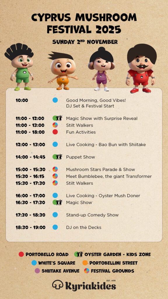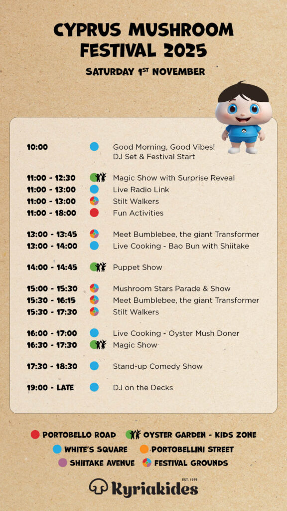 Με δέκα διαφορετικές ποικιλίες μανιταριών να πρωταγωνιστούν στα πιάτα και τη μουσική, τα παιχνίδια και τη γιορτινή διάθεση να συμπληρώνουν το σκηνικό, το Cyprus Mushroom Festival 2025 υπόσχεται ένα αξέχαστο διήμερο γεμάτο διασκέδαση, γεύση και μαγεία.