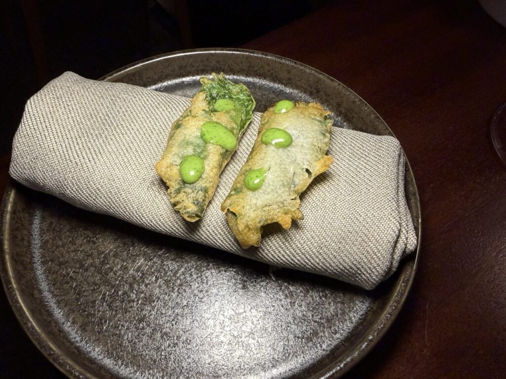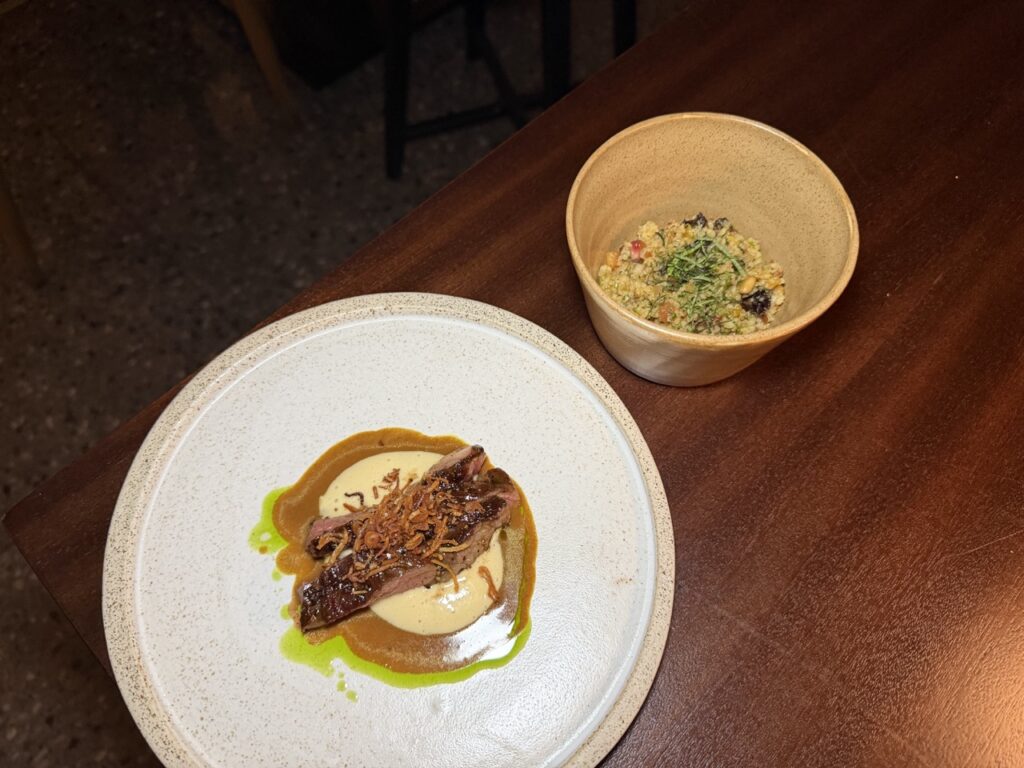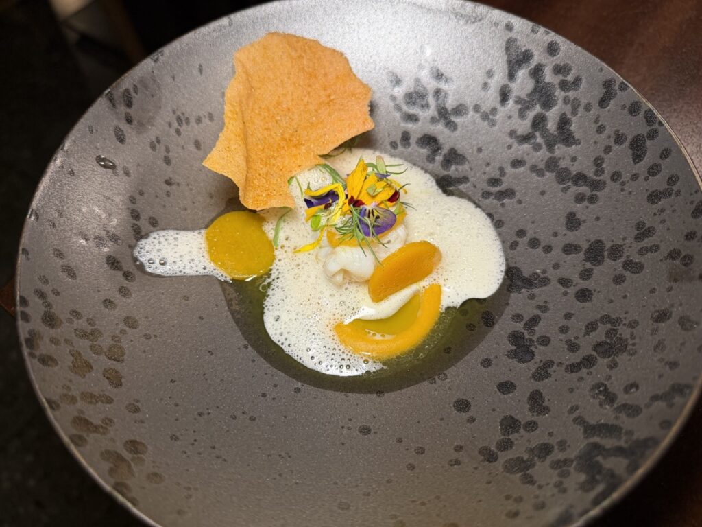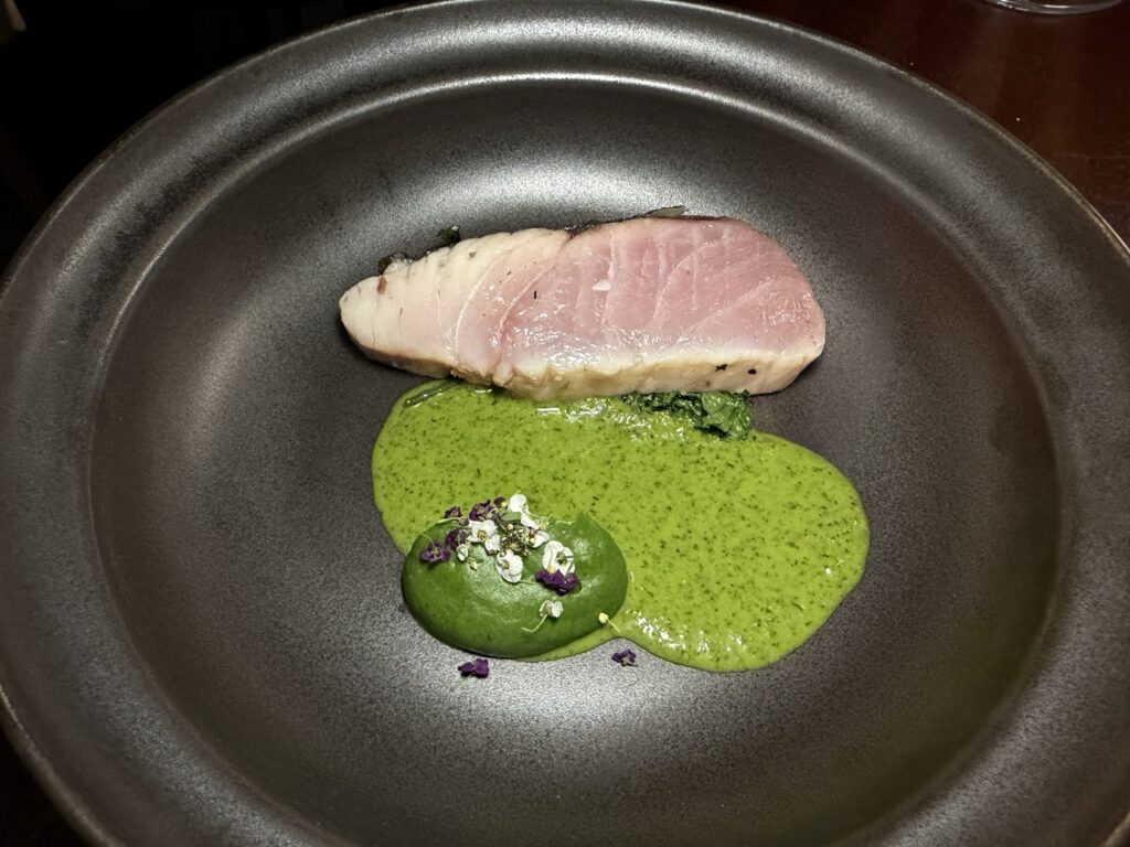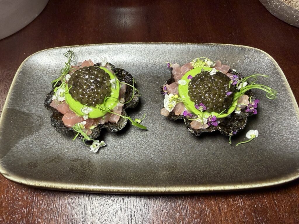 Ξεχωριστές στιγμές της βραδιάς αποτέλεσαν, εκτός από τα αριστουργηματικά amuse-bouche, το beef tartare με στρείδι και χαβιάρι oscietra, που εντυπωσίασε με τη φινέτσα και τη θαλασσινή του ένταση, καθώς και η καραβίδα με κολοκύθα, tandoori και beurre blanc, ένα πιάτο γεμάτο βάθος και αρωματική πολυπλοκότητα. Το μαγιάτικο συνάντησε στον ουρανίσκο το λάδι από shiso, η αγκινάρα Ιεροσολύμων τη μαγική σος με σπόρια τόνκα, ενώ δεν έλειψαν και τα στοιχεία φωτιάς, με το USDA Black Angus κρέας να αναδεικνύεται μέσα από εξειδικευμένα μπαχαρικά και εκλεπτυσμένες σάλτσες.