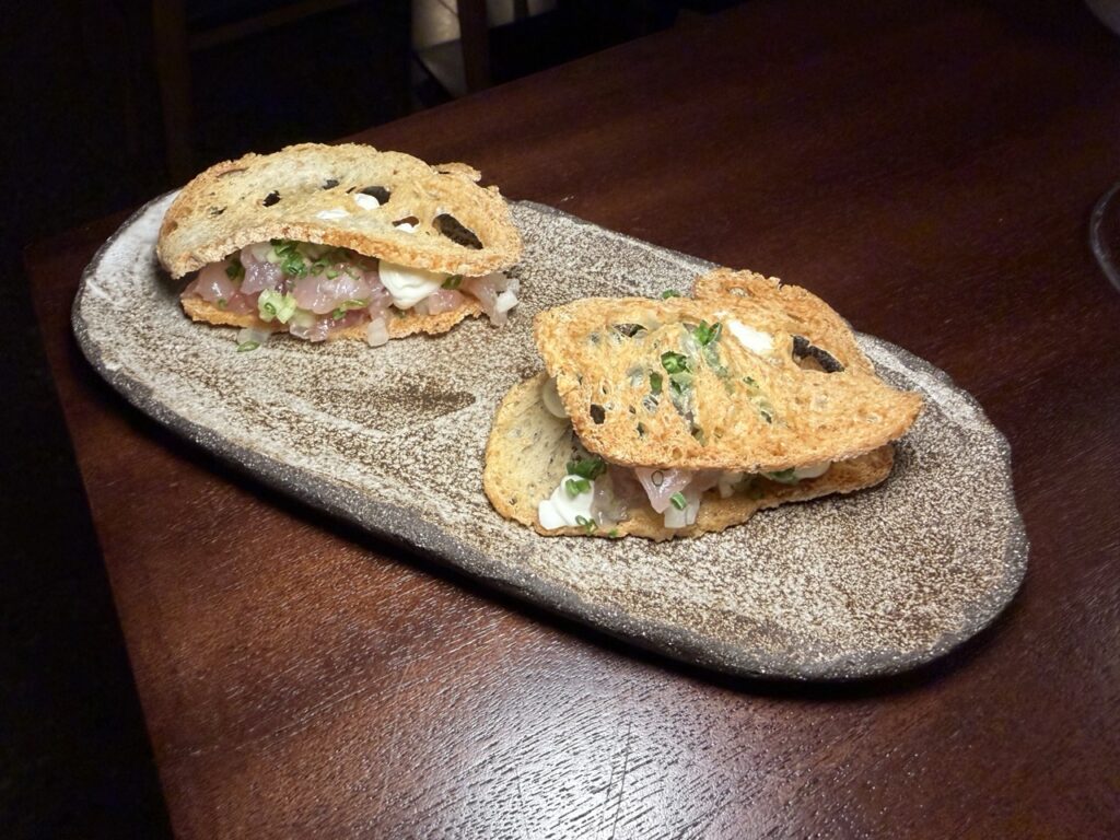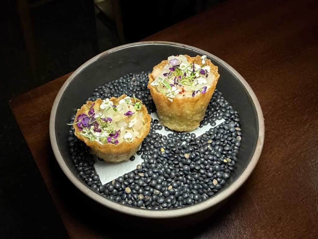 Το εστιατόριο ήταν κατάμεστο από γαστρονόμους που συνέρευσαν από κάθε άκρη του νησιού, με όλες τις διαθέσιμες θέσεις να κλείνουν από τις πρώτες κιόλας ημέρες της ανακοίνωσης του Four Hands Dinner. Ένα μενού επιμελημένο από κοινού από τους δύο chefs, που υπογράμμισε τη δημιουργική τους σύμπραξη.