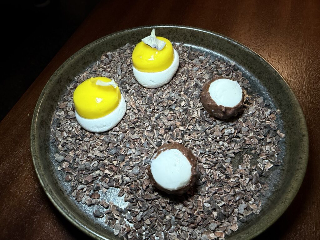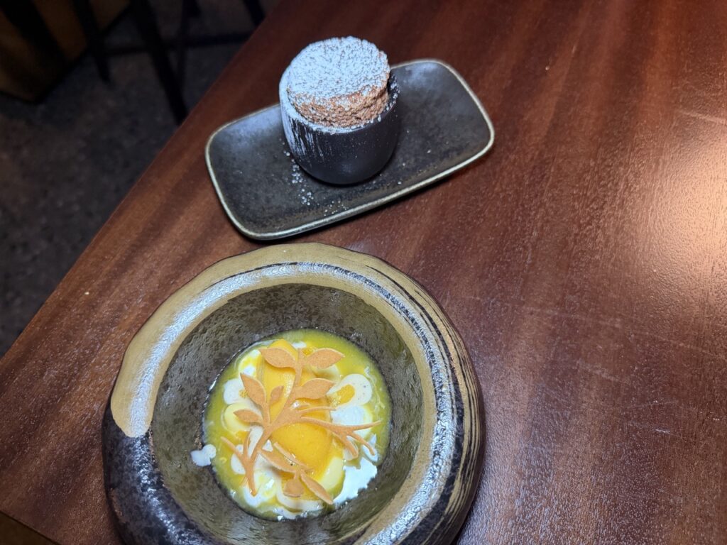 Οι δύο επιδόρπιοι πειρασμοί κύλησαν αρμονικά ο ένας μετά τον άλλο, με τον πρώτο να φέρνει δροσιά και φινέτσα μέσα από το yuzu, το πρόβειο γιαούρτι και τη λουΐζα, ξυπνώντας τον ουρανίσκο με οξύτητα και αρώματα, ενώ το δεύτερο, το σοκολατένιο σουφλέ με μανταρίνι και διακριτικό κάρι, πρόσφερε βάθος, ζεστασιά και ένταση, αφήνοντας μια πλούσια αλλά ισορροπημένη επίγευση που ολοκλήρωσε ιδανικά τη βραδιά.