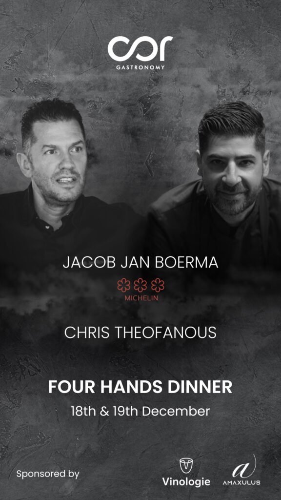 Μια βραδιά υψηλής γαστρονομίας, γεμάτη χαρά, αρώματα και διεθνείς επιρροές, ζήσαμε όσοι βρεθήκαμε στο διήμερο γαστρονομικό event που πραγματοποιήθηκε στο εστιατόριο Cor Gastronomy. Ένα υψηλού επιπέδου μενού γευσιγνωσίας, με οικοδεσπότη τον καταξιωμένο chef Chris Theofanous, ο οποίος υποδέχθηκε τον βραβευμένο με 3 αστέρια Michelin, chef Jacob Jan Boerma, του ιστορικού The White Room στο Άμστερνταμ, σε μια μοναδική γαστρονομική συνάντηση που άφησε τις καλύτερες εντυπώσεις.