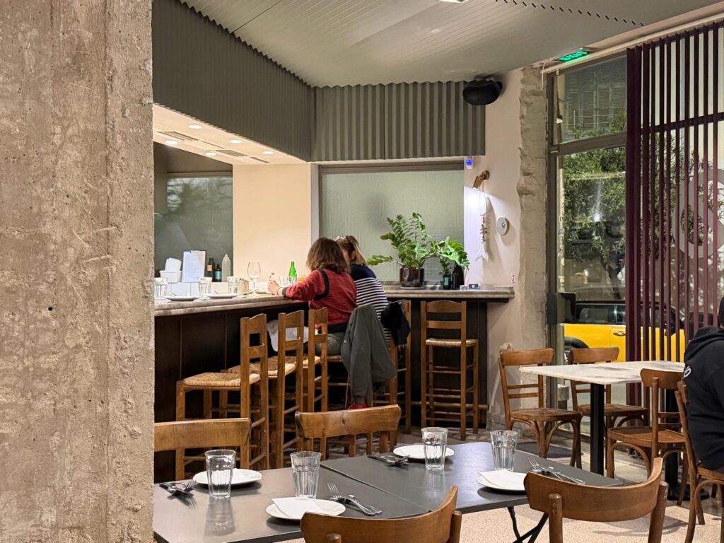 We had heard the best, put it on our list, and after wandering through the surrounding streets, we stopped the moment we saw the simple, tilted “Φ” on the glass façade. We had arrived. A space with industrial references, mosaic flooring and raw concrete columns, yet at the same time warm, human and inviting.