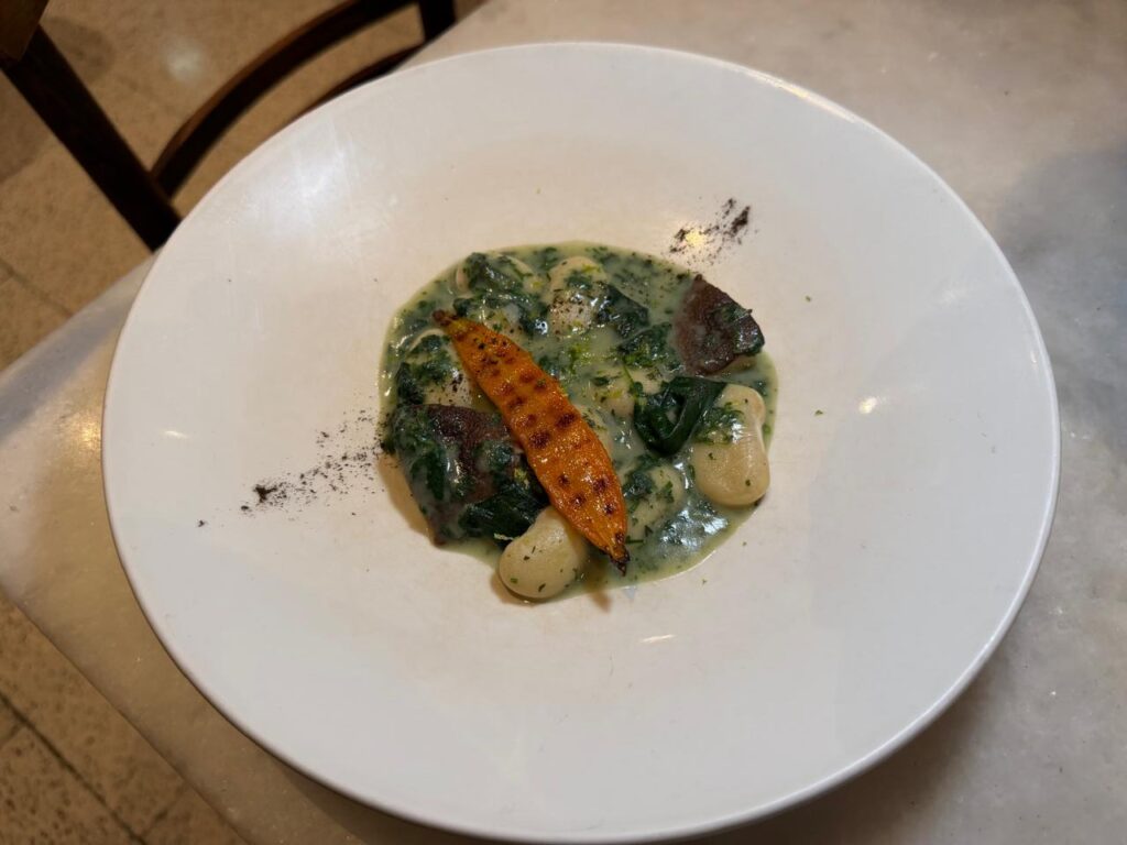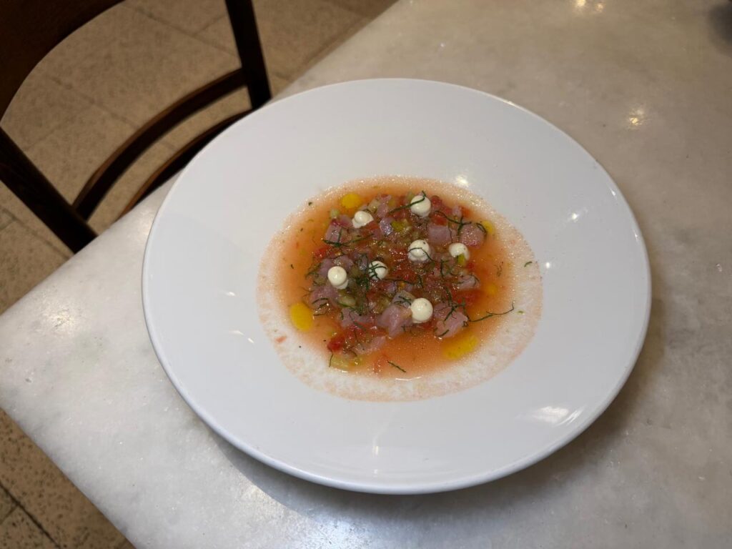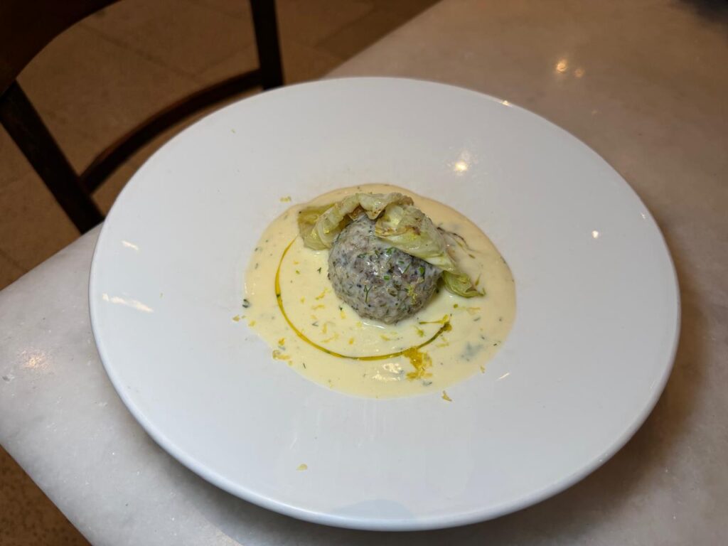 The marinated grey mullet—yes, the same fish that gives us bottarga—paired with stuffed vegetable broth and tarama, brought memory and technique together in a dish that moves effortlessly between the familiar and the contemporary. A dish I didn’t want to finish—and frankly didn’t want to share—but we both ended up falling for it.