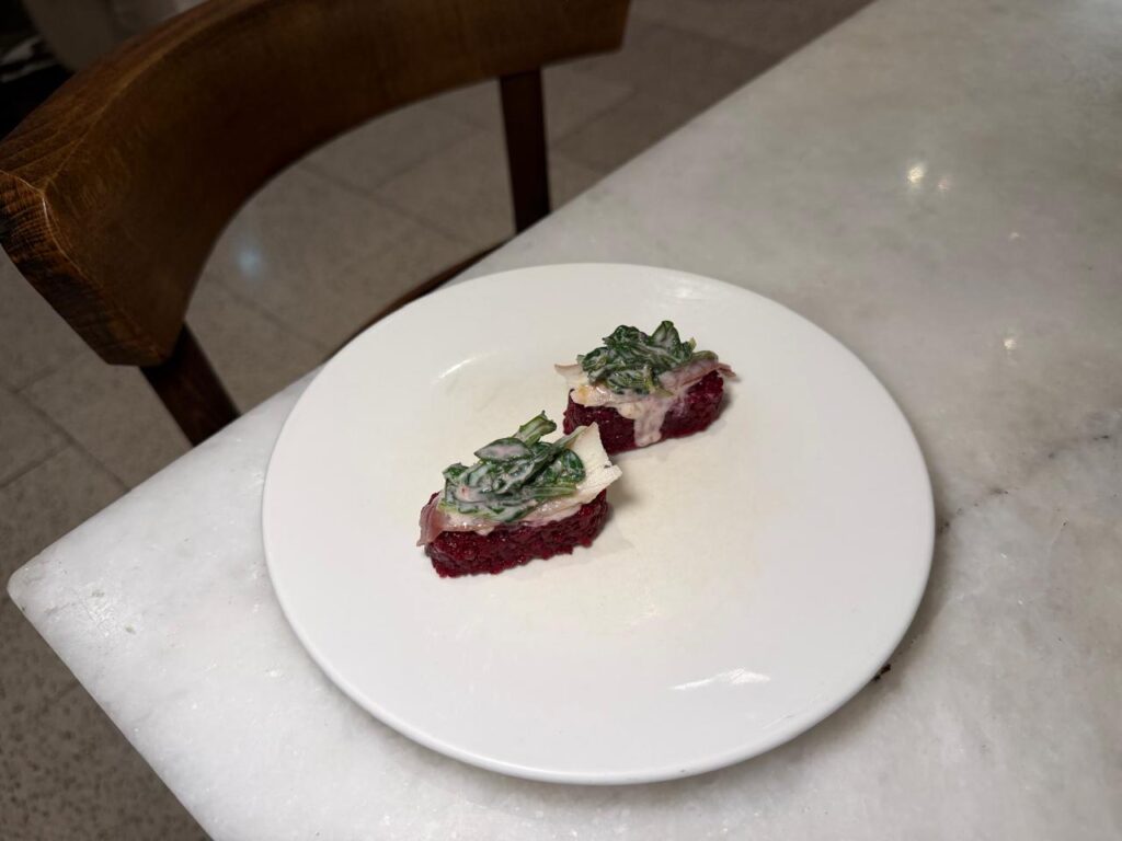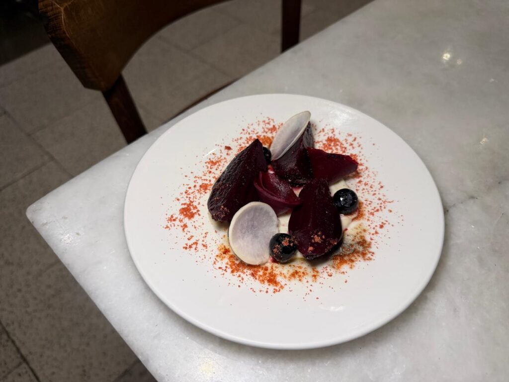 Και κάπου εκεί, η “σαλάτα” με τα βιολογικά παντζάρια, τα μύρτιλα και την κρέμα αμυγδάλου έρχεται να ισορροπήσει το σύνολο, δροσερή και φίνα, με το λάδι μαύρου σουσαμιού να προσθέτει βάθος και εκλεπτυσμένη επίγευση.