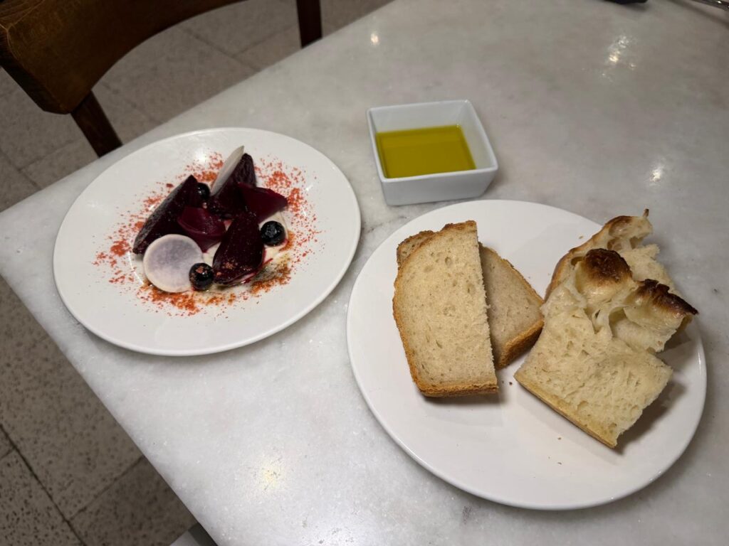 We began with the beetroot nigiri—don’t overthink it, just pick it up with your hands—topped with smoked eel and bacon vinaigrette. A small bite that pleasantly surprises, followed by the sourdough breads: a lagana-style flatbread with fermented trahana and a sesame country loaf, both warm, aromatic and the perfect way to set the tone.
