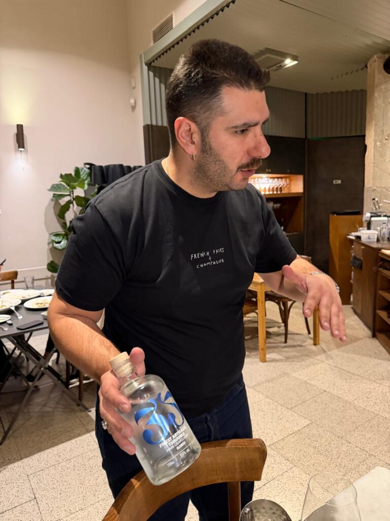 Τι να πω τώρα για τον πρόσχαρο και βαθιά καταρτισμένο σομελιέ που δεν περιορίστηκε απλώς στο να σερβίρει. Με κάθε ποτήρι, με κάθε μικρό “παντρέμα”, είχε να αφηγηθεί και μια ιστορία. Για το κρασί, για τον τόπο του, για το γιατί βρίσκεται εκεί, δίπλα σε αυτό ακριβώς το πιάτο. Τσικουδιά, ροζέ με Ξινόμαυρο και Syrah, το πολυποικιλιακό Salty Goat, Σαββατιανό, ρετσίνα σε δύο διαφορετικά ποτήρια για δύο διαφορετικές εμπειρίες, Αγιωργίτικο και ένα Port στο τέλος, όλα μετρημένα, όλα στη θέση τους. Δύο γουλιές το καθένα, αρκετές για να σε ταξιδέψουν, χωρίς ποτέ να σε βαραίνουν.