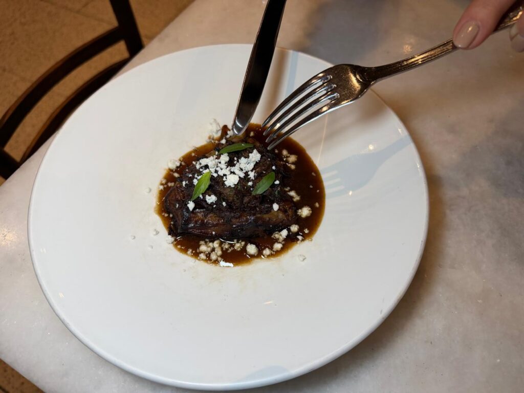 The imam that came next, with aged eggplant and slow-cooked beef tail, xinomyzithra cheese from Crete and a pastitsada-style sauce, was one of those dishes that makes you pause. Deep, rich, perfectly balanced—and gone in seconds.