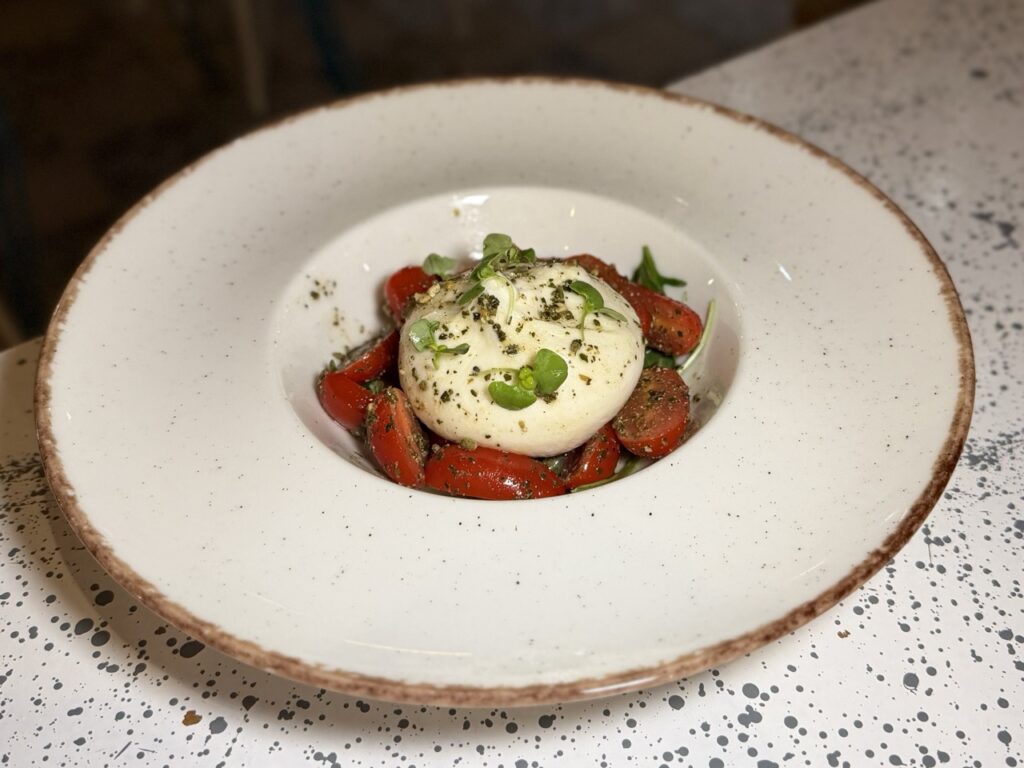 The creativity continues with a smoked aubergine dip crowned with crispy fried cauliflower, while the burrata salad with cherry tomatoes and pesto proves wonderfully refreshing, flooding the palate with the aroma of fresh basil.