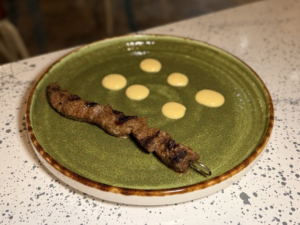 The sweet, incredibly melodic voice of the singer made the evening even more enchanting and transportive, with melodies that travelled effortlessly from past to present. Glasses raised, we toast “to good health” all around, while sharing bites of the beef souvlaki scented with oriental spices—a dish you should definitely elevate further by dipping it into the accompanying honey-mustard sauce.