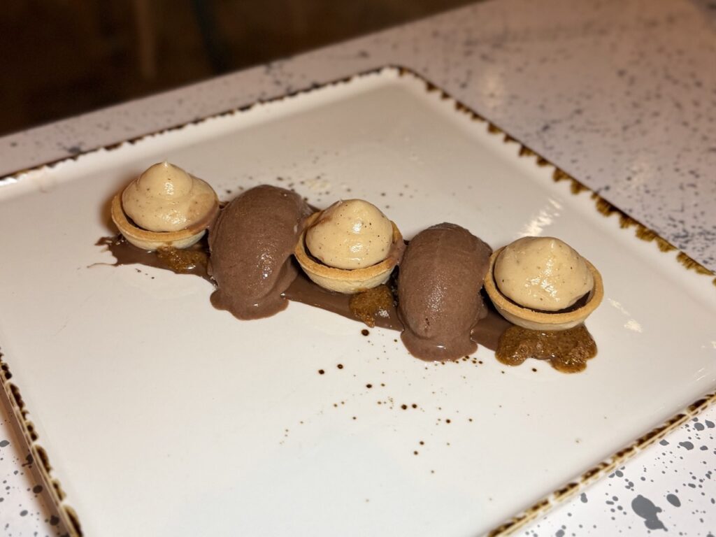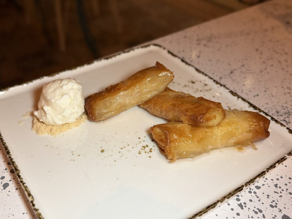 Mountain and countryside herbal tea for herb lovers, a superb espresso and a dessert wine for the rest, and for everyone: homemade orange cake, along with chocolate tartlets filled with caramel and hazelnut cream. The ultimate dessert, however, comes in the form of warm galaktoboureko rolls—crispy on the outside, creamy within—meeting fragrant mastic ice cream in the mouth.
