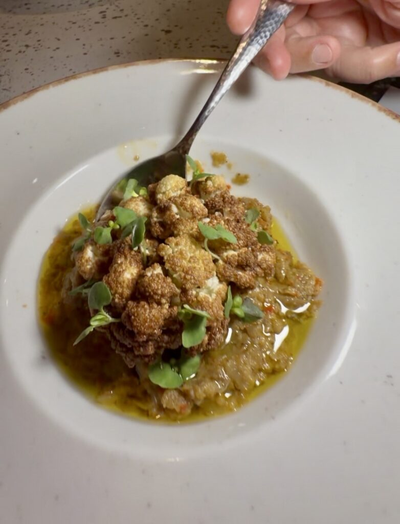 Πρωτοτυπότατη η συνέχεια, με πρωταγωνίστρια την καπνιστή μελιτζανοσαλάτα, που καπελώθηκε με τραγανό τηγανητό κουνουπίδι, ενώ ολόδροση αποδείχτηκε η σαλάτα με τυρί burrata, με ντοματίνια και πέστο, που πλημμύρισε το στόμα με βασιλικό.