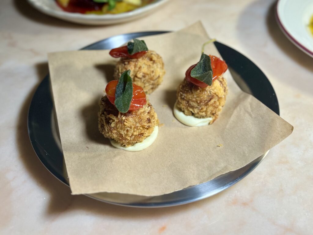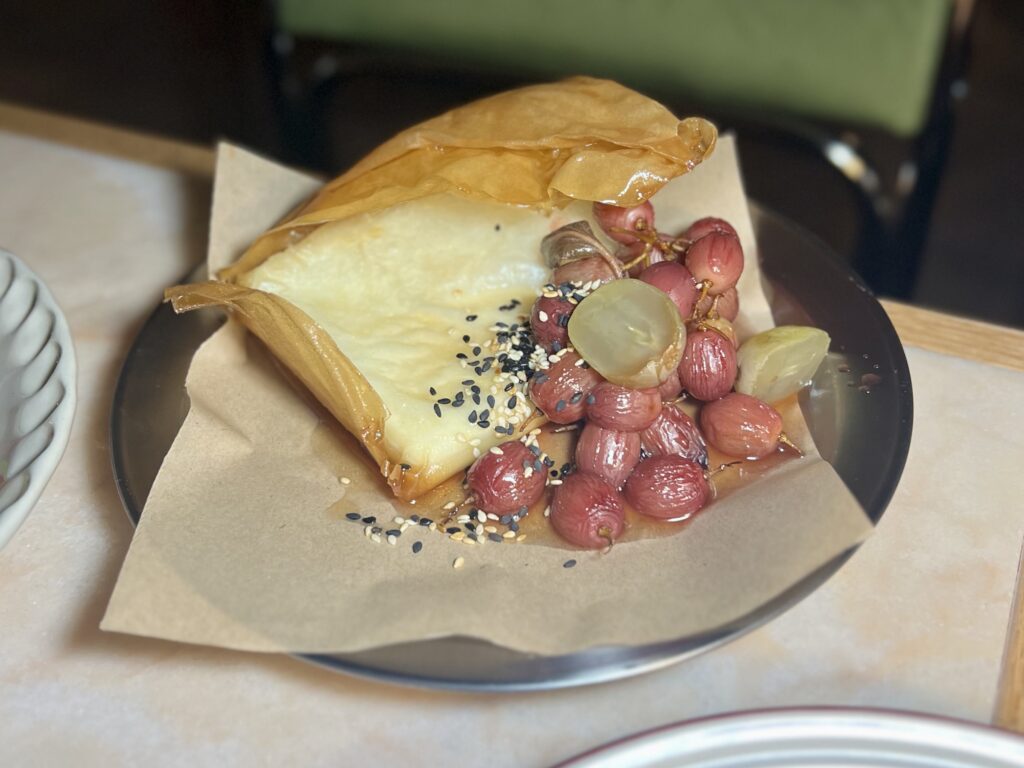 The dining room was packed with couples, families, and large groups, all sharing moments, experiences, and flavors around the table—like the feta wrapped in pastry, paired with roasted, fermented grapes. Smoky eggplant fritters, full of creativity, marry sweet and herbal notes when paired with tomato jam and fried sage.