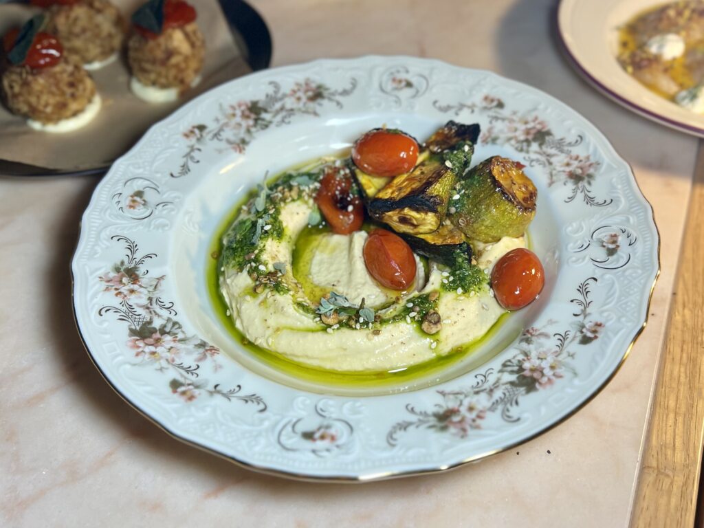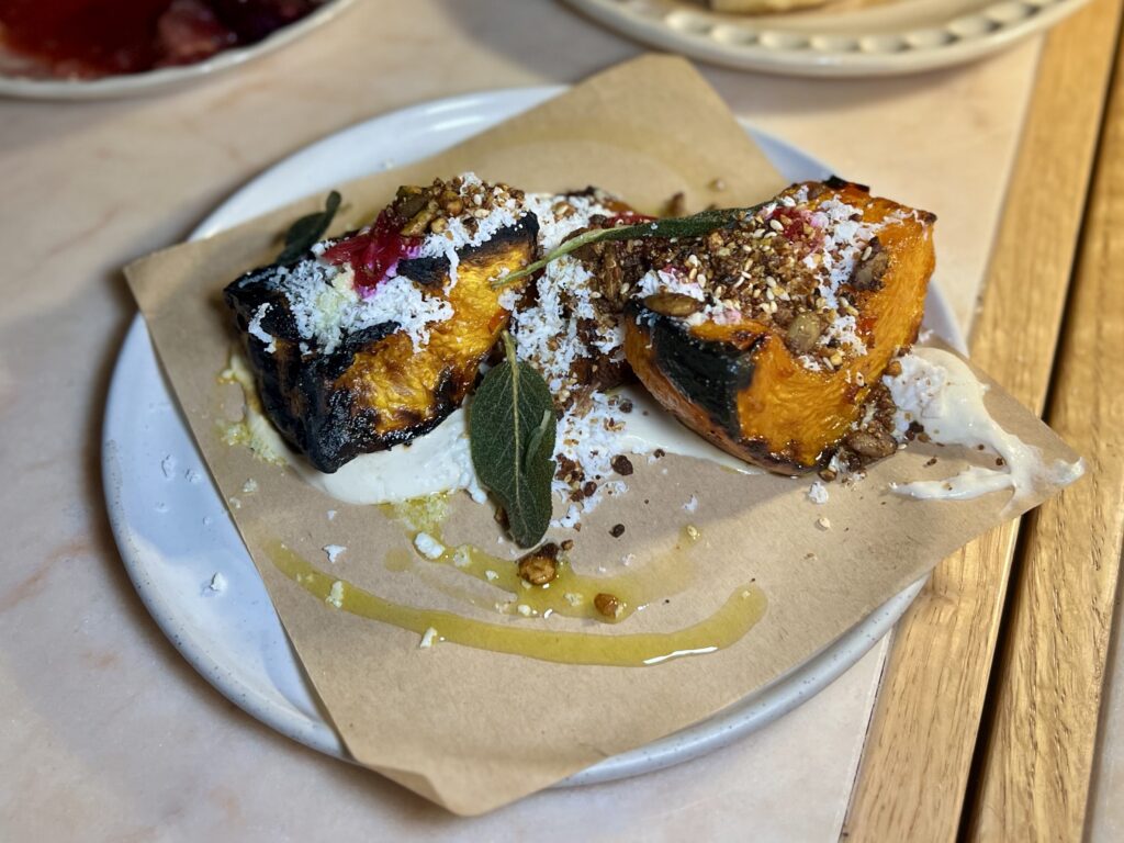 Η εποχιακή κολοκύθα ενέπνευσε την ομάδα των σεφ, οι οποίοι, αφού την έψησαν στον φούρνο και στη σχάρα, την ευλόγησαν με ταχίνι και γιαούρτι, δίνοντάς της τοπικό χαρακτήρα, απλά πασπαλίζοντάς την με γκρανόλα κυπριακού τραχανά και τρίμμα ξηρής αναρής.