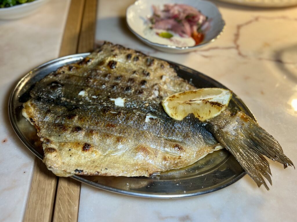 If you’re wondering about the BBQ fish on the menu—the catch of the day—the attentive staff will tell you all about it when you sit down, because, as they say, “At AYA COOKS, only fresh is served.” We enjoyed a perfectly grilled fresh sea bass, butterfly-style, cooked over coals until the skin was crisp but the flesh remained tender and moist.