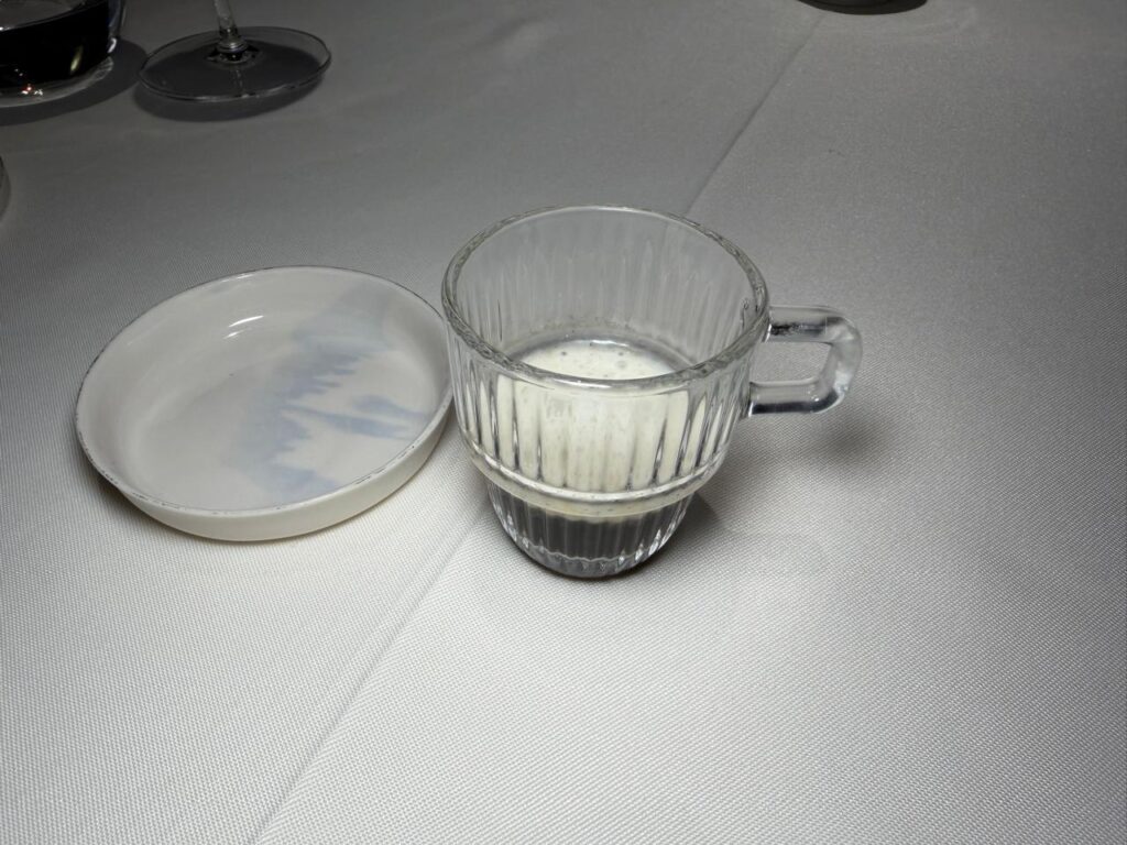 The wild mushroom cappuccino follows, grounding you. A deep, earthy broth topped with a delicate cacio e pepe risotto foam. A subtle dish — not loud, but quietly captivating.