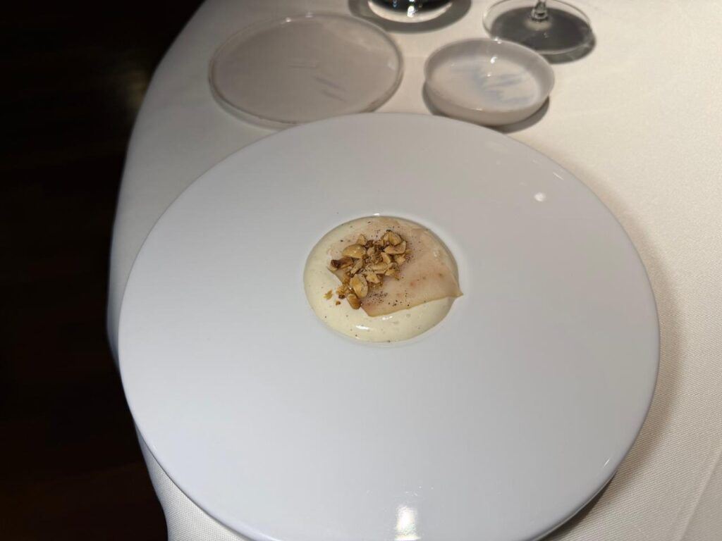 Then comes the iconic carbonara of Ettore. No pasta. A cream of cured pork, swordfish belly, and caramelized hazelnuts. A signature dish that balances memory and reinvention. One bite is enough to understand why it remains unchanged.