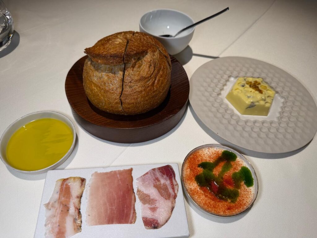 Bread and cured meats arrive as a course of their own. Sourdough bread made with a 14-year-old starter, butter with honey and pollen, Koroneiki olive oil you wish would never run out, handcrafted charcuterie, and ricotta with tomato powder and wild garlic. This is not just bread service. It’s ritual.