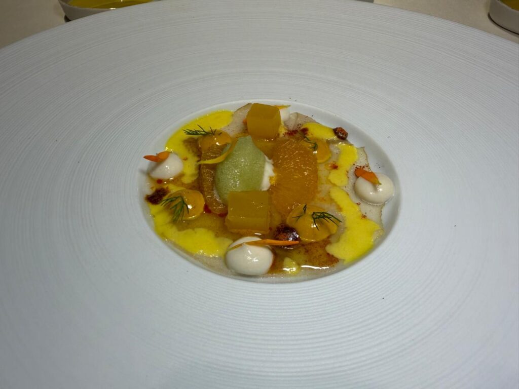 The trout, paired with fish roe, pickled beetroot, and hints of bergamot, is clean and precise. Its almost velvety texture balances beautifully with the acidity and earthy sweetness of the beetroot. A dish that feels like a true ode to haute cuisine, with multiple preparations and a level of mise en place you’d expect from restaurants holding two or more Michelin stars.