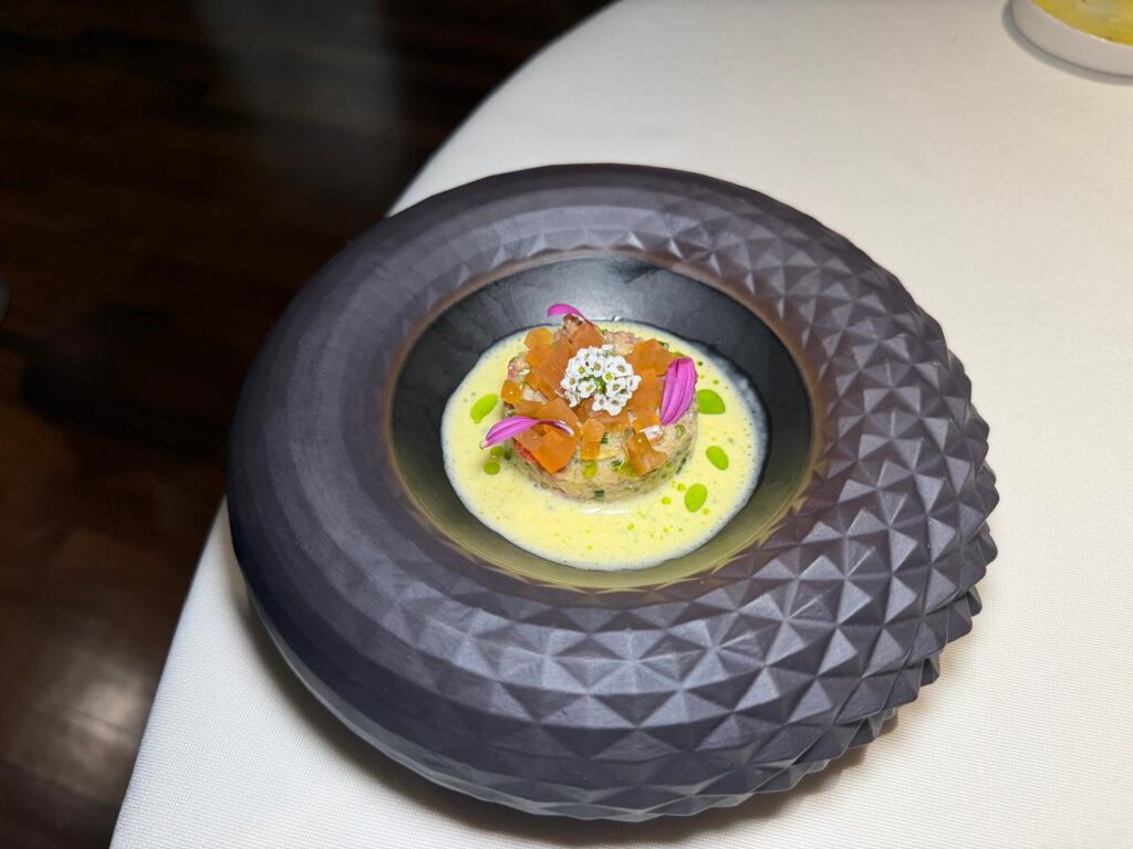 Meanwhile, the sommelier, discreet yet essential, guided us through the evening. Starting with Milia Riza Luntáne 2022, an elegant sparkling rosé that set the tone beautifully. The Malterdinger 2021 by Bernhard Huber followed, bringing freshness and acidity where needed, while a Pinot Noir Rosé accompanied the final courses with finesse.