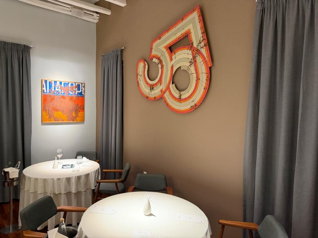 We were seated beside the impressive wine cellar, home to more than 900 labels — a true oenological universe inviting you to get lost in it. Before taking our seats, however, we paused just outside the kitchen. For a few moments, we simply observed. The chefs. The movement. The precision. A team operating as one, with rhythm, intensity, and absolute focus. No voices. Just execution.