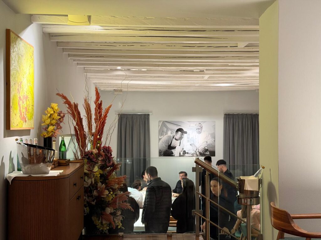 Καθίσαμε δίπλα από την εντυπωσιακή κάβα με τις περισσότερες από 900 ετικέτες, ένα πραγματικό οινικό σύμπαν που σε προκαλεί να χαθείς μέσα του. Πριν όμως πάρουμε τη θέση μας, κοντοσταθήκαμε έξω από την κουζίνα. Και για λίγα λεπτά, απλώς παρακολουθούσαμε. Τους σεφ. Την κίνηση. Την ακρίβεια. Μια ομάδα που λειτουργεί σαν ένα σώμα, με ρυθμό, ένταση και απόλυτη συγκέντρωση. Δεν υπήρχε φωνή. Μόνο πράξη.