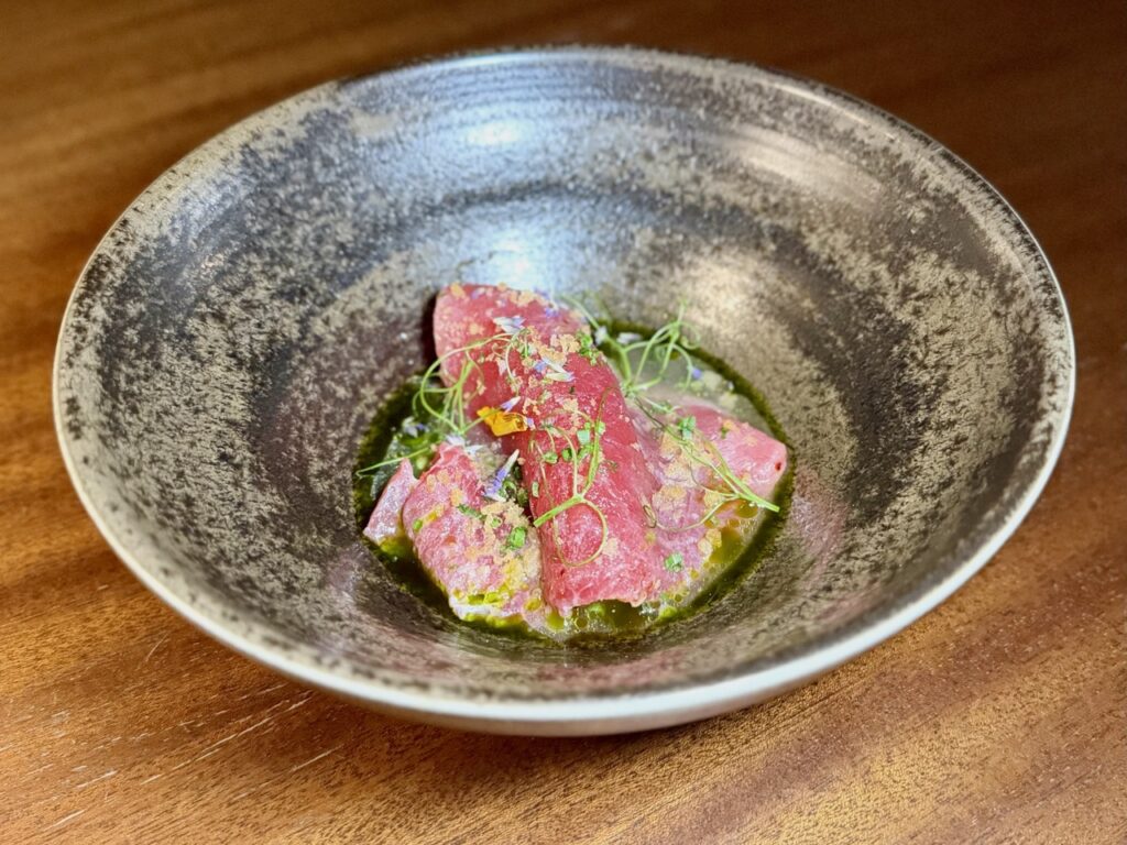 Ισορροπημένη, με κάθε σημασία της λέξης, σούπα θαλασσινών με μπλε κάβουρα και λάδι από μυρώνια, ανώτατης ποιότητας καρπάτσιο από γαλαζόπτερο τόνο, βυθισμένο σε μια μαγική, στο στόμα, σος από πράσινες ντομάτες, βινεγκρέτ τρούφας, πίκλες από εσαλότ και καβουρδισμένα φουντούκια· τα πρώτα μαγειρικά δείγματα γραφής που εντυπωσίασαν όλη μας την ομάδα.