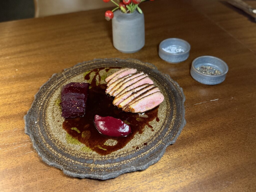 Another undeniable reason to visit the restaurant is the charcoal-grilled duck from the renowned French farm Mieral in the Dombes region, cooked over real wood embers and completing the tasting journey with beautifully crafted beet textures and a dreamy duck jus, whose aftertaste carries notes of forest fruits and red berries.