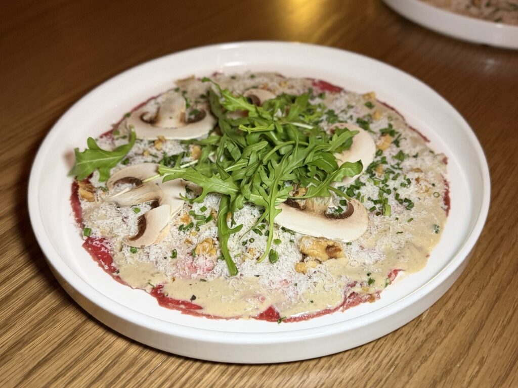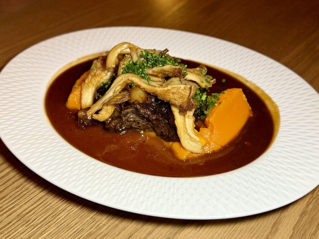 Η συνέχεια ήταν πιο βαθιά και πληθωρική, με μοσχαρίσια μάγουλα, γλυκοπατάτα και μανιτάρια, που βρήκαν τον ιδανικό τους συνοδό στο The Chocolate Block από τη Νότια Αφρική, ένα κρασί με ώριμο φρούτο και μαλακές τανίνες, απόλυτα ευθυγραμμισμένο με τον χαρακτήρα του πιάτου.