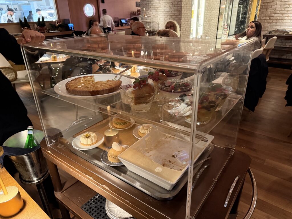 Το μεγάλο τρόλεϊ με τα γλυκά, θα το δεις κι εσύ να ταξιδεύει πολλές φορές από τραπέζι σε τραπέζι, γι’ αυτό κράτα λίγο χώρο και δακτυλόδειξε κι εσύ για το κέντρο του τραπεζιού ένα Bignè al pistacchio (άλλως Paris Brest) και, χωρίς αμφιβολία, το φρεσκότατο τιραμισού του μαγαζιού, που καλά κάνεις να το συνδυάσεις με ένα εσπρεσάκι από ποιοτικούς κόκκους καφέ, που το πλούσιο χαρμάνι του θα ομορφύνει πιότερο την όλη σου εμπειρία στο νεοαφιχθέν Little Italy.