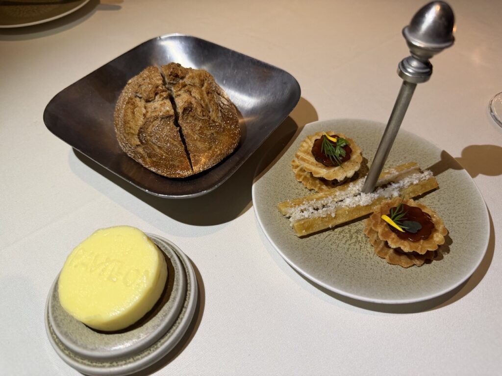 Επιλέξαμε το set menu των πέντε πιάτων το οποίο ήταν μια περιεκτική εμπειρία που ξεκίνησε ιδανικά με αριστοτεχνικα amuse-bouche, πληθωρικά σε φινέτσα και ακρίβεια, συνοδευόμενα από σπιτικό ψωμί και βούτυρο που φέρει ξεκάθαρα τη σφραγίδα του Yannick Alléno – απλό, αλλά με βάθος και χαρακτήρα.