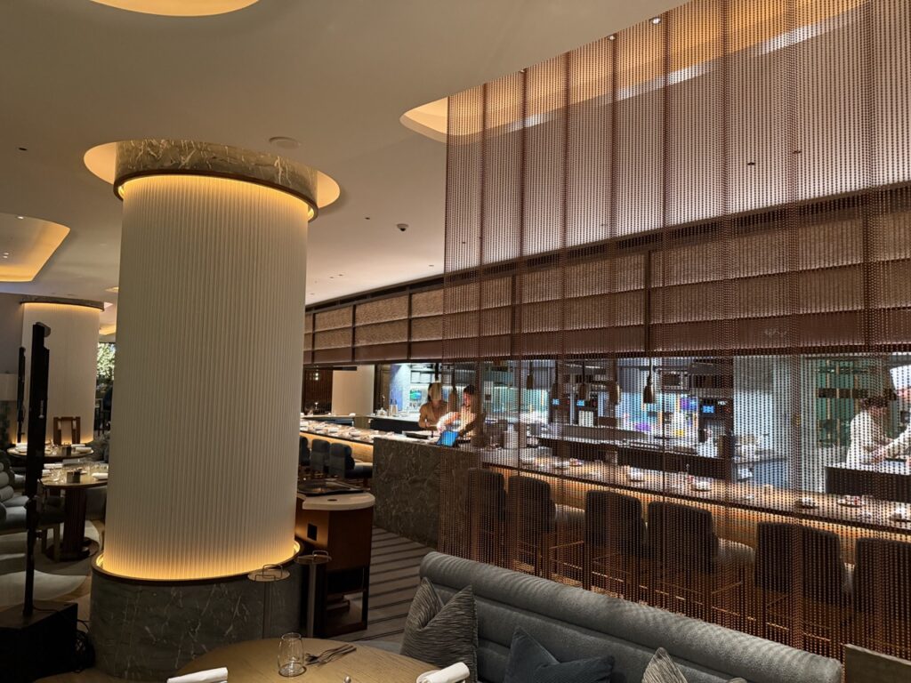 The space itself is striking and immediately captivating. A vast open kitchen dominates the room, functioning almost like a live stage; from every seat, diners can observe the chef’s large, impeccably coordinated brigade working with absolute focus on both the à la carte dishes and the tasting menus. The design is contemporary, elegant and inviting, defined by clean lines and a sense of understated luxury that sits perfectly within the Four Seasons setting.