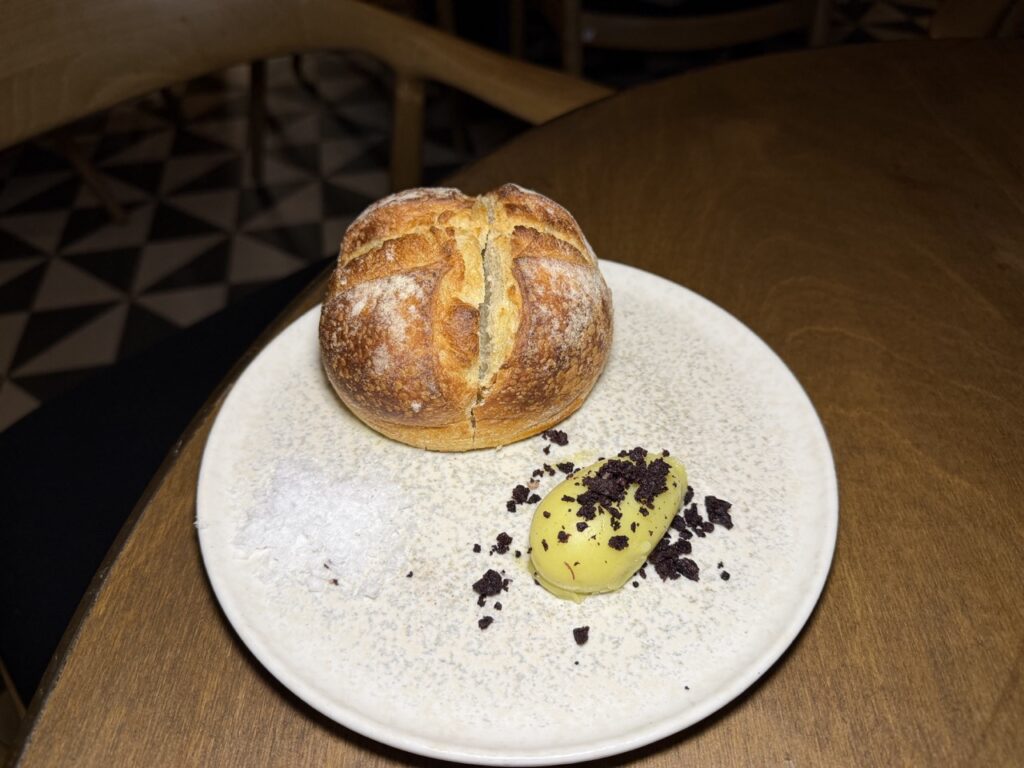 As for us, we opted for wine by the glass. A fragrant, travel-inspired Hatiri Aromatico (Alexakis Wines, Malvasia di Candia Aromatica, Heraclion, Crete) opened up our senses, perfectly accompanied by warm sourdough bread with olive oil butter – made even better when sprinkled with shards of dried olive.