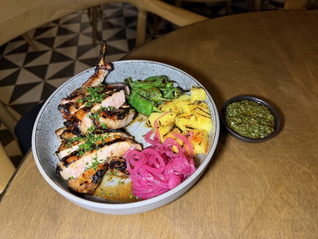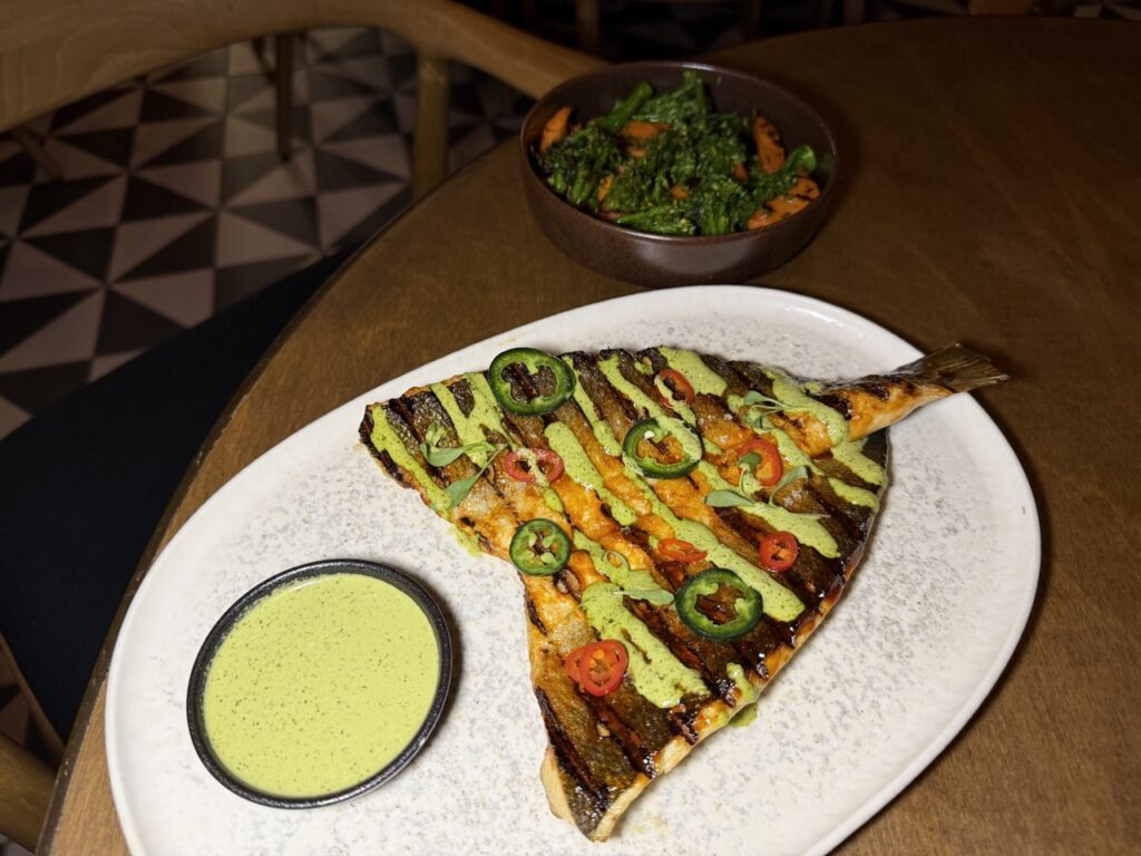 A glass of Chardonnay from Kyperounta (Epos) once again proved why it’s considered one of the island’s top wines, especially alongside the sharing tacos filled with pork, guacamole, pickled red onions and jalapeños. It also paired beautifully with the standout main course, Seabass robatayaki: a butterflied seabass grilled over the robata, finished with lime and a glossy chili glaze, served with a variety of vegetables and a gently acidic aji verde sauce. A dish I would order again without hesitation.