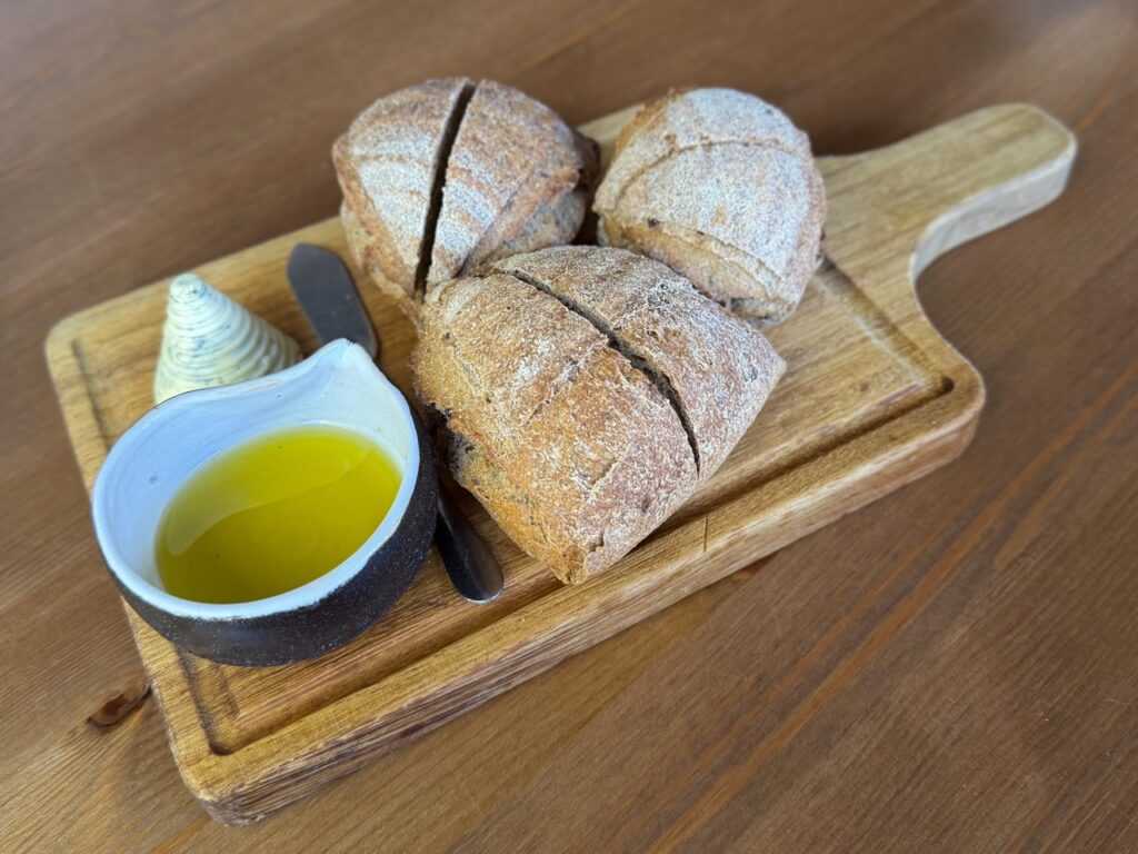 Ψωμί προζυμένιο με εξαιρετικό παρθένο ελαιόλαδο και βοτανοευλογημένο βούτυρο για το ξεκίνημα και συνεχίζουμε με τραγανή σαλάτα από φυλλώδη λαχανικά, ραντισμένη όπως πρέπει με άριστη σε οξύτητες βινεγκρέτ.