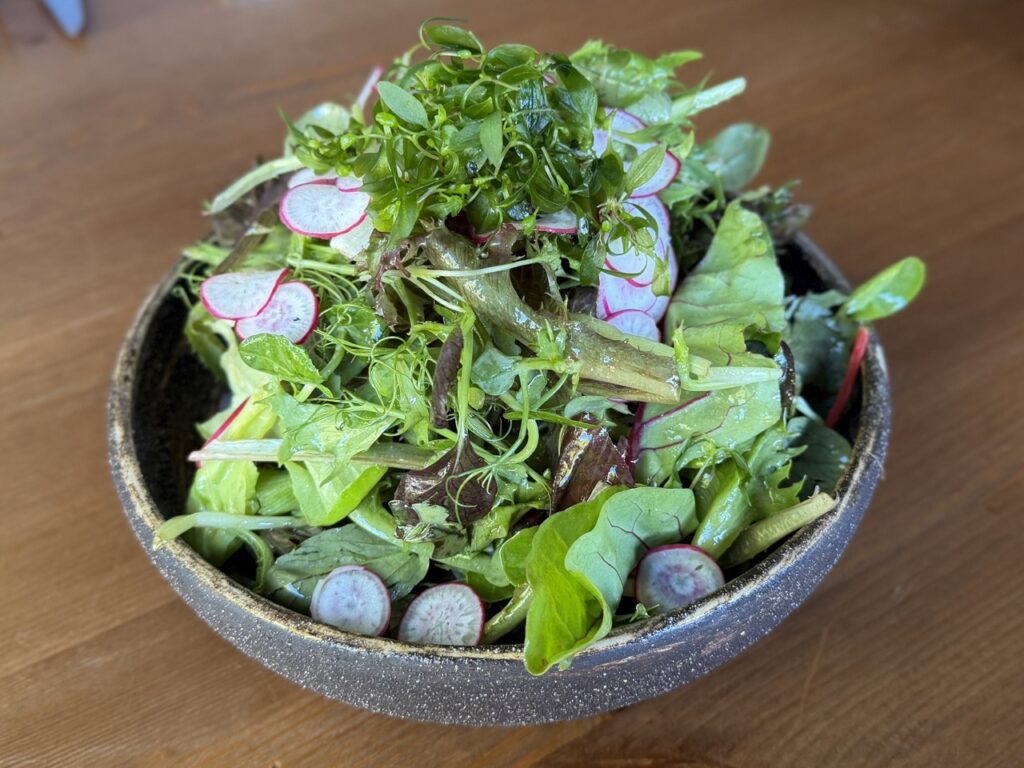 We began with sourdough bread, excellent extra virgin olive oil and herb-infused butter, followed by a crisp leafy green salad, dressed just right with a perfectly balanced, bright vinaigrette.