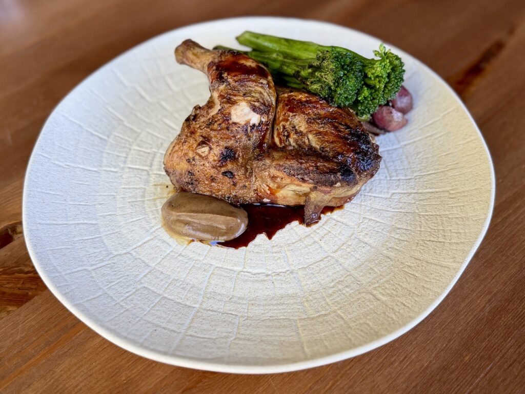 Η τραγανή σαλάτα butterhead, ο πουρές κουνουπιδιού με τρούφα, αλλά και οι signature πατάτες του Salt & Fire και τα ψητά λαχανικά συνόδευσαν με τον γευστικότερο τρόπο τα φαγητά μας — όπως ακριβώς συνόδευσαν και το baby ιταλικό πετεινάρι (€35), το οποίο, αφού μπήκε σε άλμη, ψήθηκε στη σχάρα με καστανό βούτυρο και θυμάρι, φτάνοντας κοντά μας με πουρέ μανιταριών και αρωματικό jus κοτόπουλου.