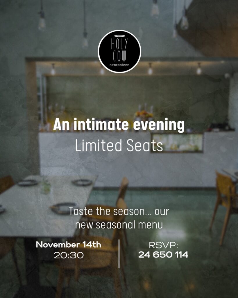 Αυτή την Παρασκευή, 14 Νοεμβρίου, το Holy Cow Neocanteen σας προσκαλεί σε μια ξεχωριστή βραδιά γευσιγνωσίας, όπου θα παρουσιαστούν τα ολοκαίνουργια εποχιακά πιάτα του εστιατορίου — την ίδια μέρα που λανσάρονται!